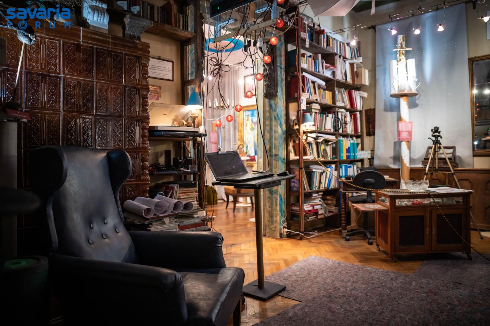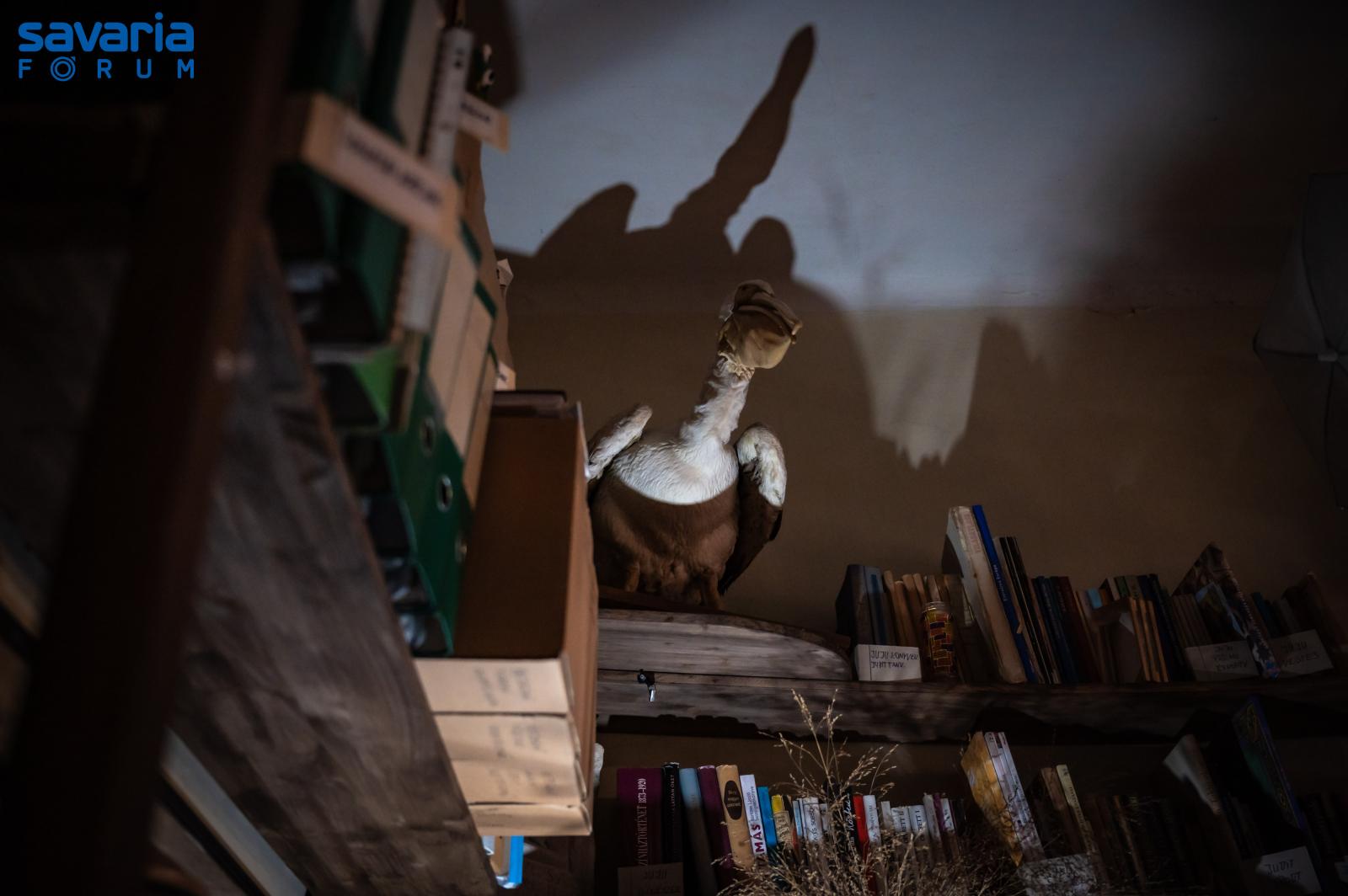 A könyvár-dolgozóban, ami öt éve egyben a Vasi TIT tévéstúdiója is, a Rákosi-címer és a feszület is jól megfér egymással – a Mediterrán Krisztus keresztjének íve egy tengerparti nyaralásról hozott pálmalevél –, és itt kapott helyet egy éjszakai autóút során talált kitömött pelikán is.