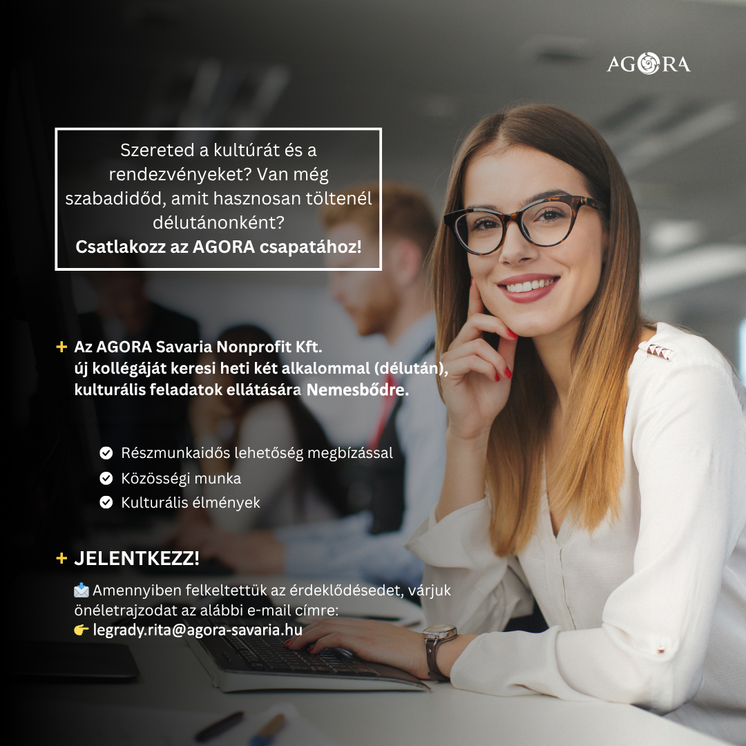 Csatlakozz az AGORA csapatához! Két délutáni alkalommal végezhető, kulturális feladatok ellátására keresünk új kollégát Nemesbődre. Részmunkaidő, közösségi munka, kulturális élmények!