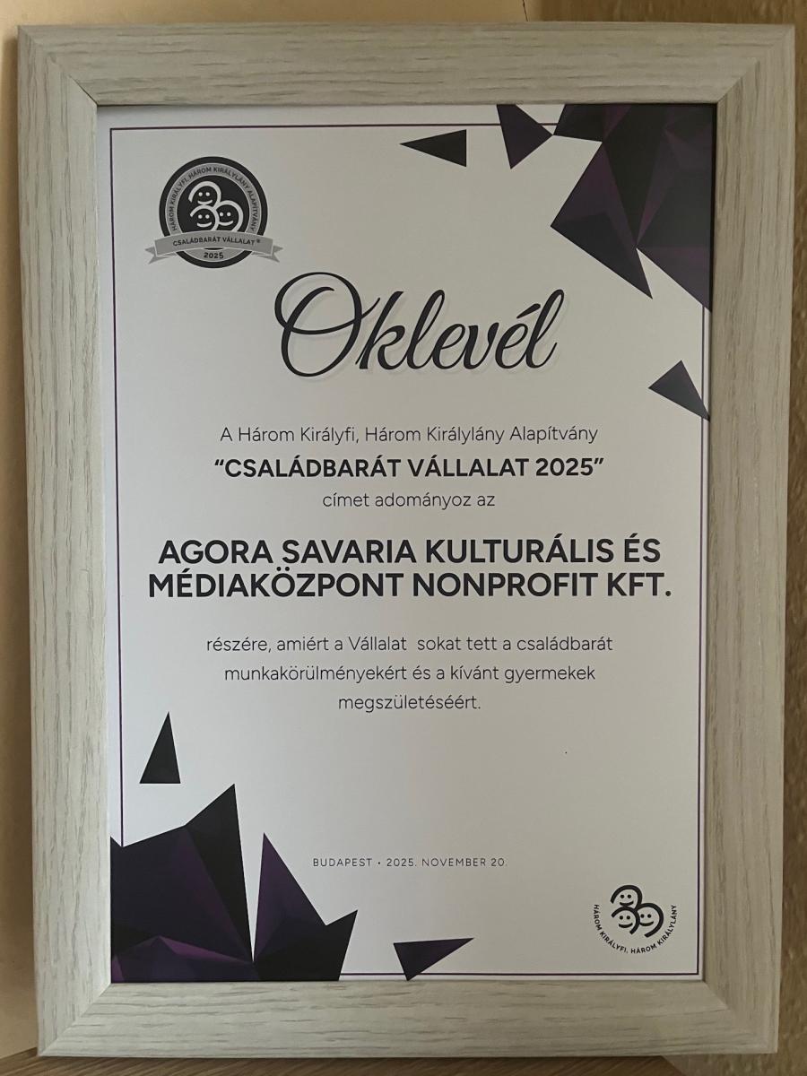 Az AGORA Savaria Kulturális és Médiaközpont Nonprofit Kft. újra jelentős sikert ért el: a Három Királyfi, Három Királylány Alapítvány idei gálaestjén ismét átvehette a rangos „Családbarát Vállalat 2025” díjat. Intézményünk sorozatban második évben részesült ebben az elismerésben, hiszen 2024-ben is a díjazottak között volt, ami különösen hangsúlyossá teszi a vállalati kultúránkba épített, tudatosan felépített családbarát szemléletet.
